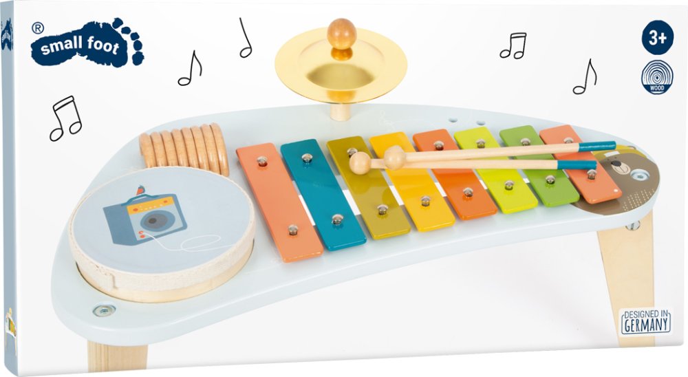 ¡El oso Bruno crea música! Esta mesa de música de construcción robusta se apoya en tres patas y anima a los niños a tocar diferentes instrumentos y descubrir nuevos sonidos con platillos, xilófono, sonajero y un tambor extraíble. ¡Las teclas del xilófono están codificadas por colores, por lo que las primeras canciones son fáciles para los niños! Viene con mazos robustos de madera maciza y partituras. ¡Es mucha música motivadora y aprendizaje divertido! Visualmente, esta mesa de música y sonido destaca por su diseño alegre y su combinación armónica de madera natural y colores azules modernos. Además de practicar la percepción acústica, este instrumento también entrena lúdicamente el sentido del ritmo, la rítmica y la primera comprensión de los tonos musicales. Principales características: Desarrolla la motricidad fina y la creatividadUna divertida introducción al mundo del sonido y el ritmoLas teclas del xilófono emiten diferentes tonosMesa todo en uno