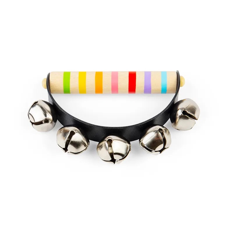¡Cascabeles para bebés y niños pequeños con cinco pequeñas campanas en un arco de plástico flexible que enseñan a los niños el ritmo! El juguete es fácil de agarrar con las manos pequeñas, por lo que es adecuado desde el nacimiento. Favorece el desarrollo de la percepción acústica y es ideal para la educación musical temprana y el aprendizaje de los primeros ritmos. También ayuda a desarrollar la destreza y la coordinación. Este juguete está fabricado con materiales de alta calidad y obtenidos de forma responsable. Cumple con todas las normas de seguridad europeas actuales. No es un instrumento musical, sino sólo un juguete. Principales características: mango de madera lisa en tamaño para agarre infantilintroducción temprana al mundo del sonido y el ritmoadecuado desde el nacimientodiseño de arco iris a rayas
