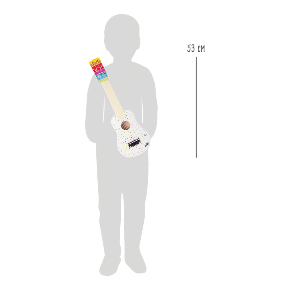 Esta guitarra blanca con pequeños lunares de colores es un accesorio imprescindible para todos los jóvenes amantes de la música. La guitarra también es un componente esencial de una banda infantil o sala de juegos. Puede servir para aprender los primeros acordes y el sentido del ritmo. Con la ayuda de una guitarra pequeña, los niños pueden aprender a acompañar las primeras rimas y canciones.  Descripción principal: los niños aprenden acordes y oído musical