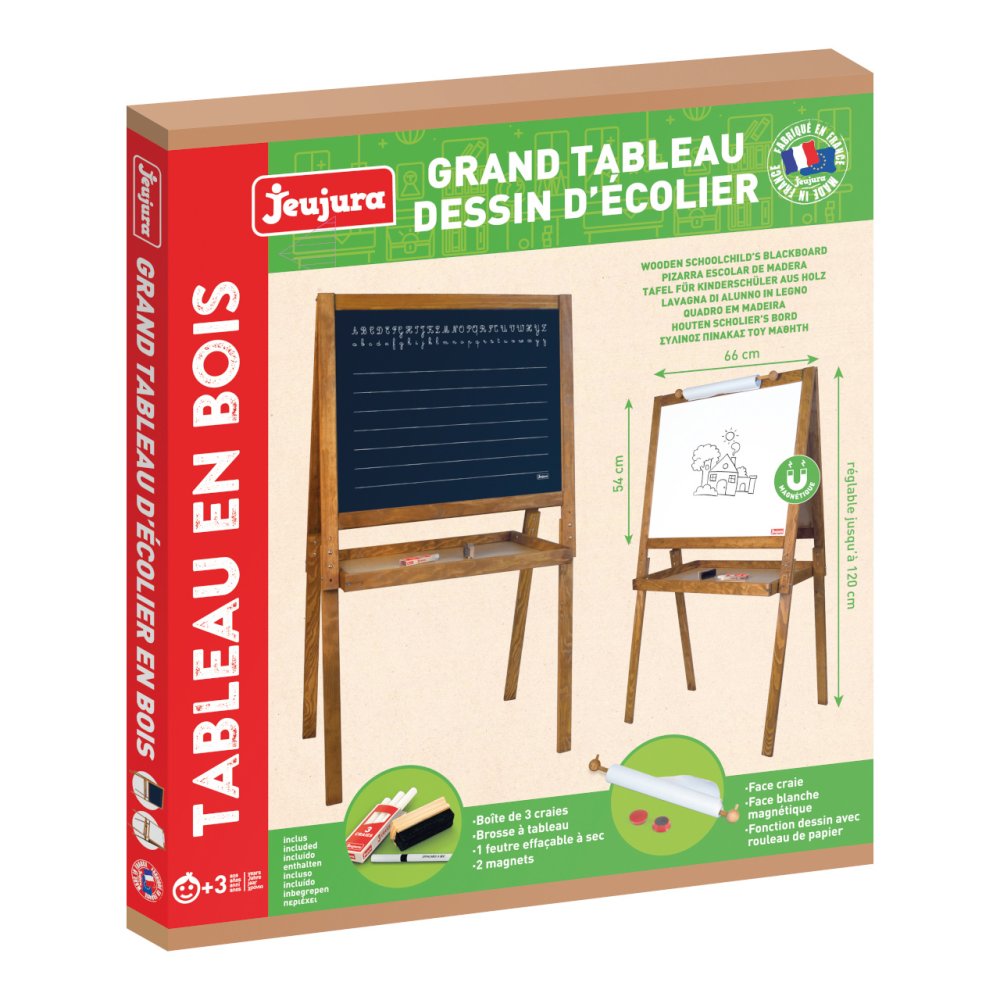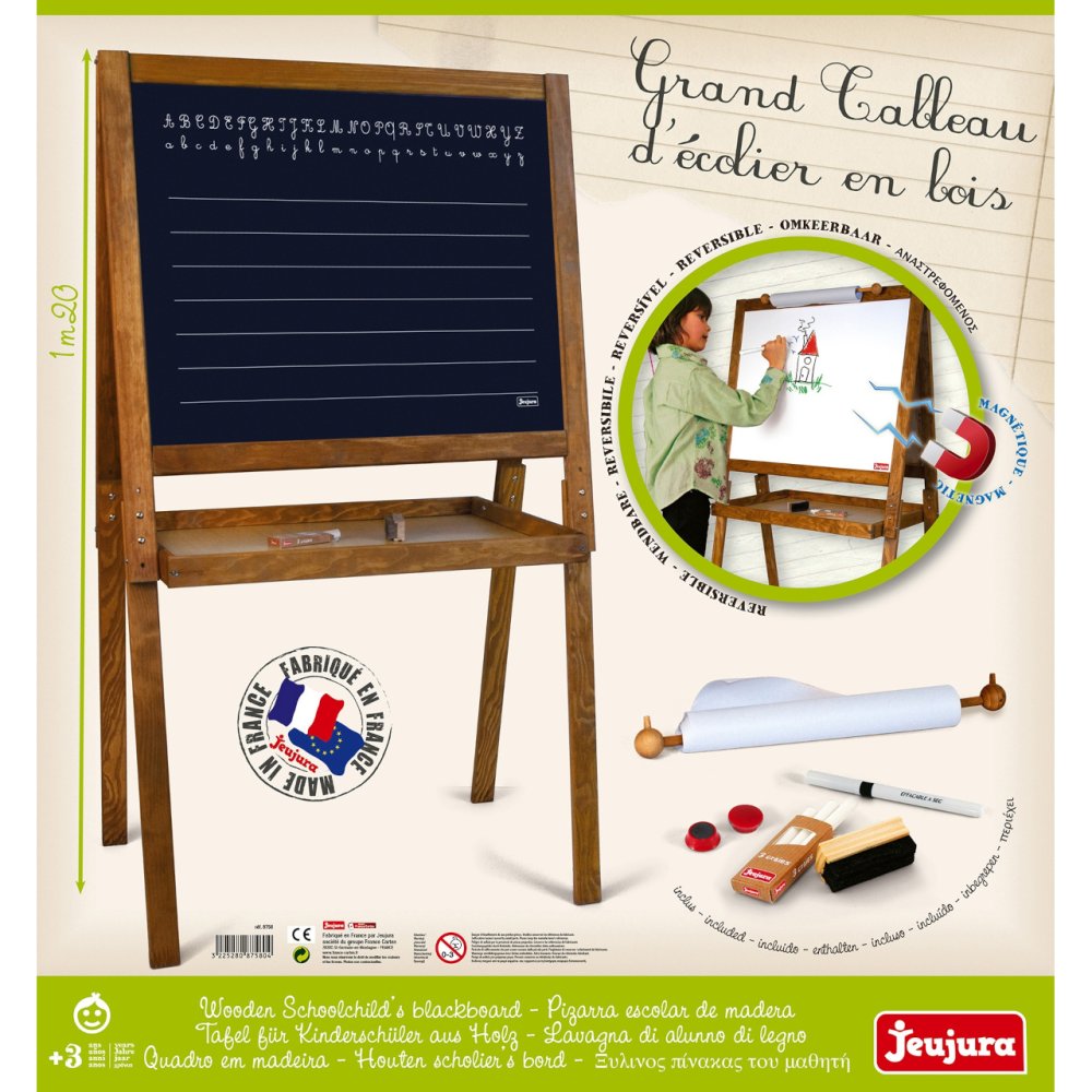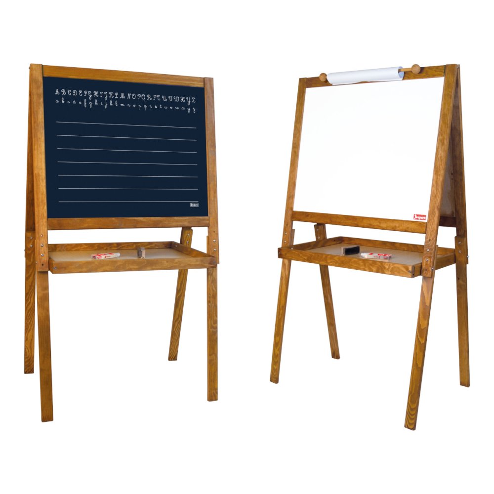Doble pizarra sobre estructura de madera abierta con altura ajustable, equipada con un gran espacio de almacenamiento o depósito. La pizarra negra se usa para escribir y dibujar con tiza, la pizarra blanca se puede describir con rotuladores especiales y borrar con una esponja de fieltro. La pizarra negra está rayada y contiene patrones de letras para facilitar el aprendizaje. El equipamiento también incluye un soporte para rollos de papel. Fabricado en Francia, con madera maciza de haya y pino de origen francés. Los componentes se tratan exclusivamente con pinturas y barnices a base de agua. Embalado en cartón impreso con tintas vegetales. El paquete incluye tizas, rotulador, esponja, imanes y 1 rollo de papel. Principales características: pizarra, 3 tizas, rotulador, esponja, 2 imanes y rollo de papeldimensiones de la pizarra 66×54 cmpara tizas/magnética para rotuladoreslineado, patrones de escriturasoporte para rollos de papelgran espacio de almacenamientoaltura ajustable 115–120 cmfabricado en Francia