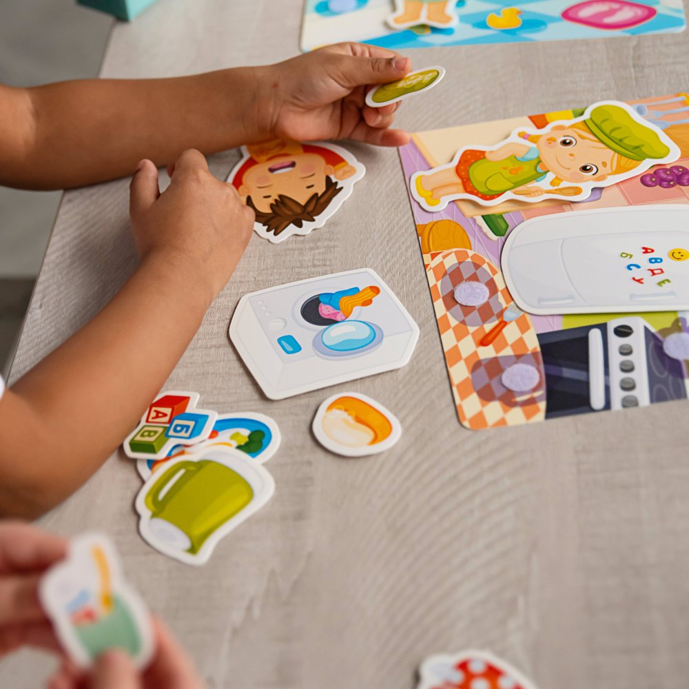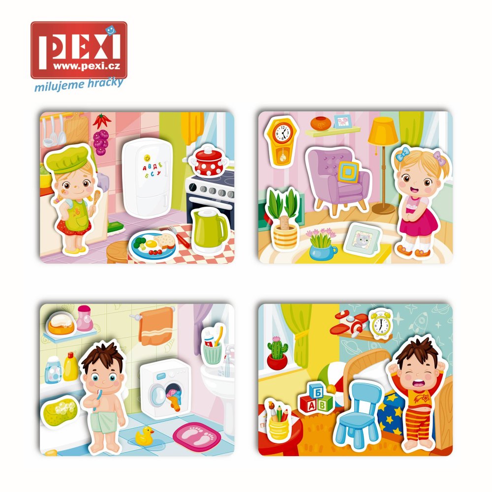 Entrena la coordinación mano-ojo, las habilidades motoras finas y descubre los detalles de tu vida cotidiana. ¡Equipa tu propia casa! ¿Dónde va la olla, a la cocina o a la bañera? ¿Y dónde debe el niño lavarse los dientes? Encuentra las respuestas correctas y coloca los objetos en su lugar en cada habitación. ¿Qué hay dentro?El juego contiene 4 láminas de plástico grandes y flexibles con velcro y 20 piezas separadas que se colocan en las láminas con velcro. Gracias a este truco, las piezas individuales no se caen y se mantienen en su sitio. Todas las piezas están hechas de plástico resistente pero delgado con un tratamiento superficial especial que es agradable al tacto para los niños. ¿Cómo jugar? Toma las piezas una por una y cuéntales a los niños lo que hay en ellas.Luego toma la lámina con los contornos de los objetos y anima al niño a encontrar el objeto correcto para cada contorno y a fijarlo en el lugar correcto con velcro. Principales características: mejora las habilidades motoras entrena la expresión y el habla desarrolla el pensamiento y la memoria refuerza el mantenimiento de la atención