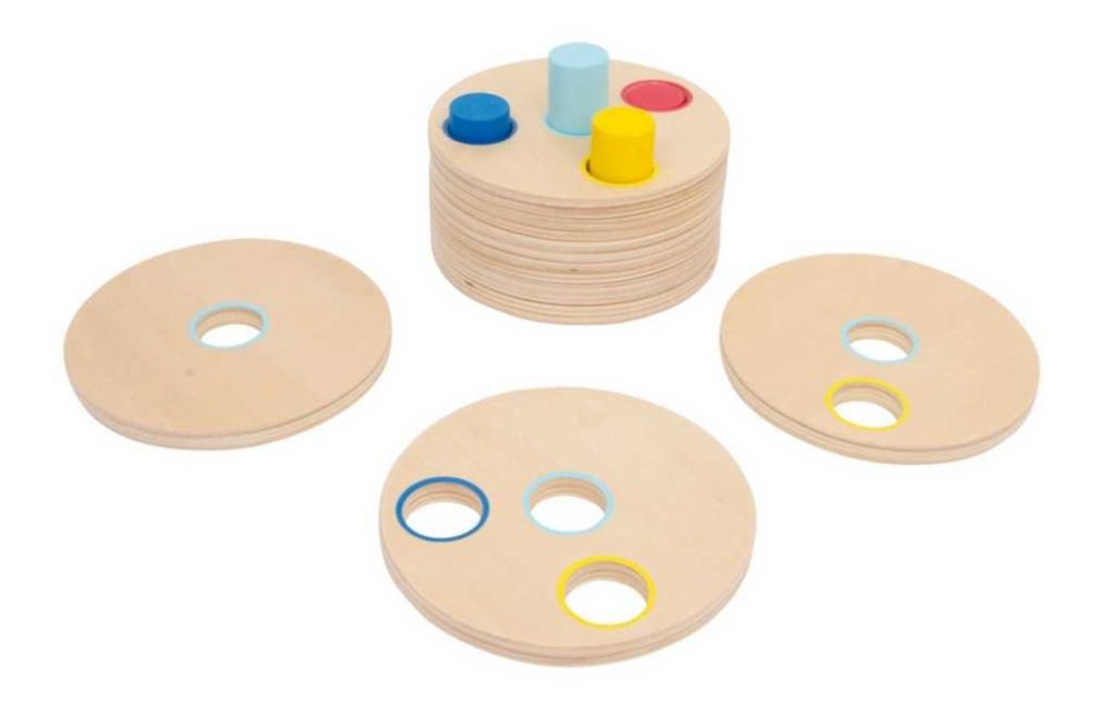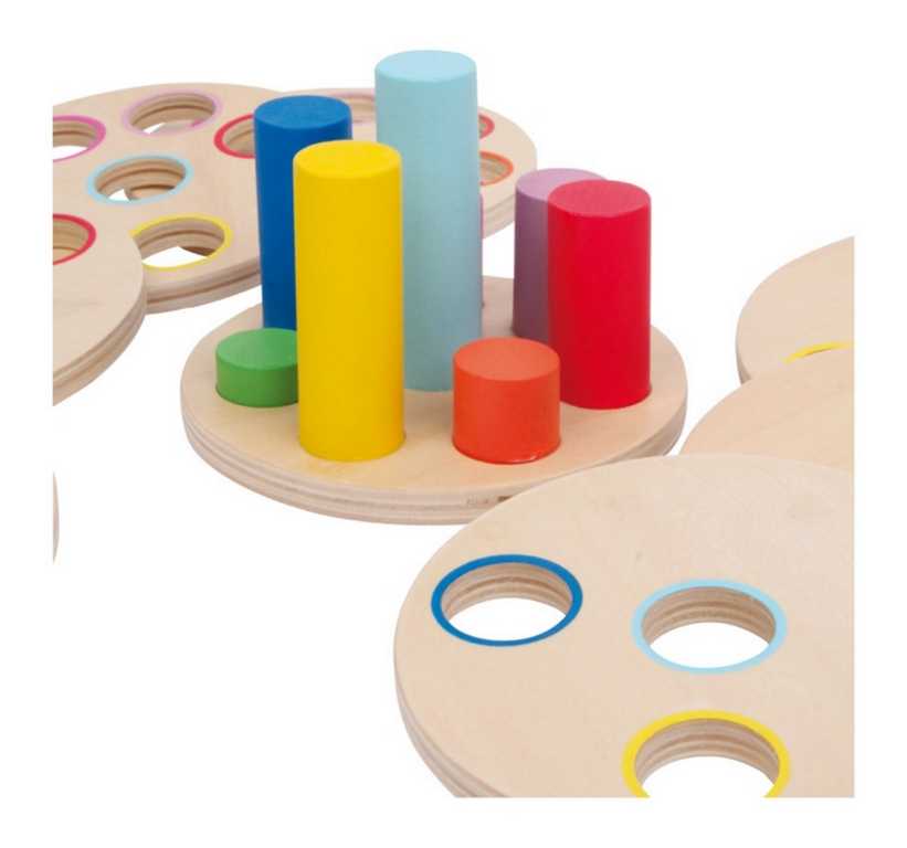 Observa bien, piensa, prueba y coloca adecuadamente: un excelente juego de apilar para entrenar la motricidad y la coordinación ojo-mano. Los discos sólidos (de 1 cm de grosor) de madera contrachapada finamente lijada deben deslizarse sobre las varillas de colores. Las varillas son de diferentes longitudes y cada disco siempre tiene un orificio menos que el anterior, el apilamiento conduce naturalmente a una única solución. Los círculos de colores en los discos facilitan el juego, pero pueden girarse para que los colores no sean visibles y el juego se vuelva más desafiante. Principales características: contiene 9 piezas (8 discos y un soporte)diseño de calidadfomenta el desarrollo del pensamiento lógico