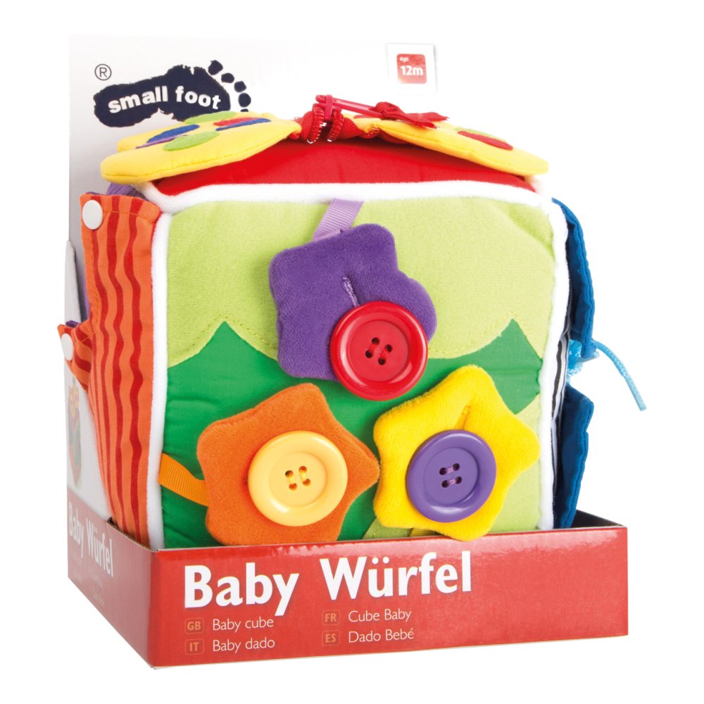 Cubo de peluche con diferentes cierres para ejercicios de motricidad fina de los dedos de los niños. Cada tipo de cierre se encuentra en un lado diferente del cubo: cordones, botones, cremallera, broches, velcro y con cordones de nailon. Principales características: entrena las habilidades motoras