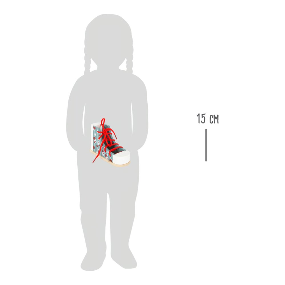 ¡Ah, así que así es como se atan los zapatos! Con este práctico zapato de madera con un diseño moderno, los niños pueden aprender a atarse los cordones. Al mismo tiempo, también practican la paciencia y las habilidades motoras. Zapato estable que resiste todos los intentos de atado. Para los niños, atarse los cordones puede ser realmente difícil, por lo que este zapato es una ayuda de aprendizaje ideal. Adecuado para niños en edad preescolar. Principales características Ayuda estableEstampado alegreLongitud adecuada del cordón