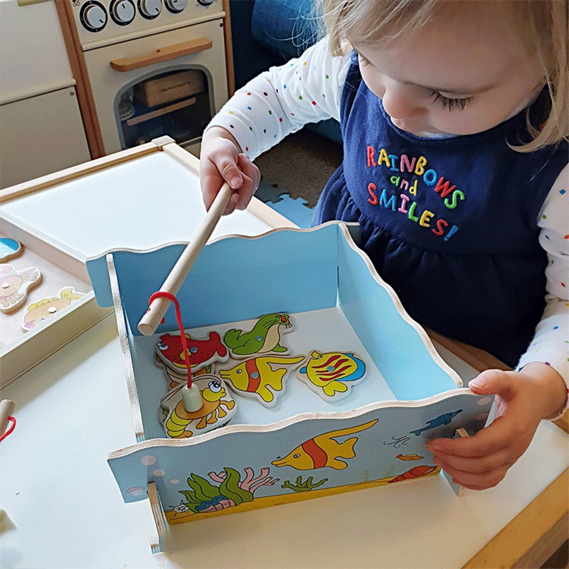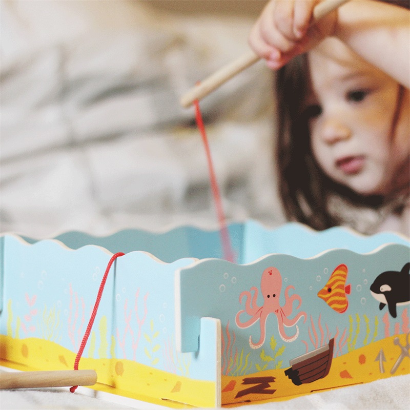 ¡Coge tu caña de pescar y disfruta de este juego! Averigua quién puede pescar más peces. Este acuario de madera contiene muchas criaturas coloridas, incluyendo peces, caballitos de mar y cangrejos. Ayuda a desarrollar la destreza y la coordinación. Fabricado con materiales de alta calidad procedentes de fuentes responsables. Cumple con las normas de seguridad europeas actuales. Principales características: desarrolla la destreza y la coordinacióncontiene 12 criaturas marinas, 1 caja de madera maciza, estructura de tanque, 2 cañasApto para niños a partir de 3 años.