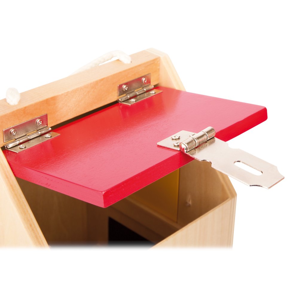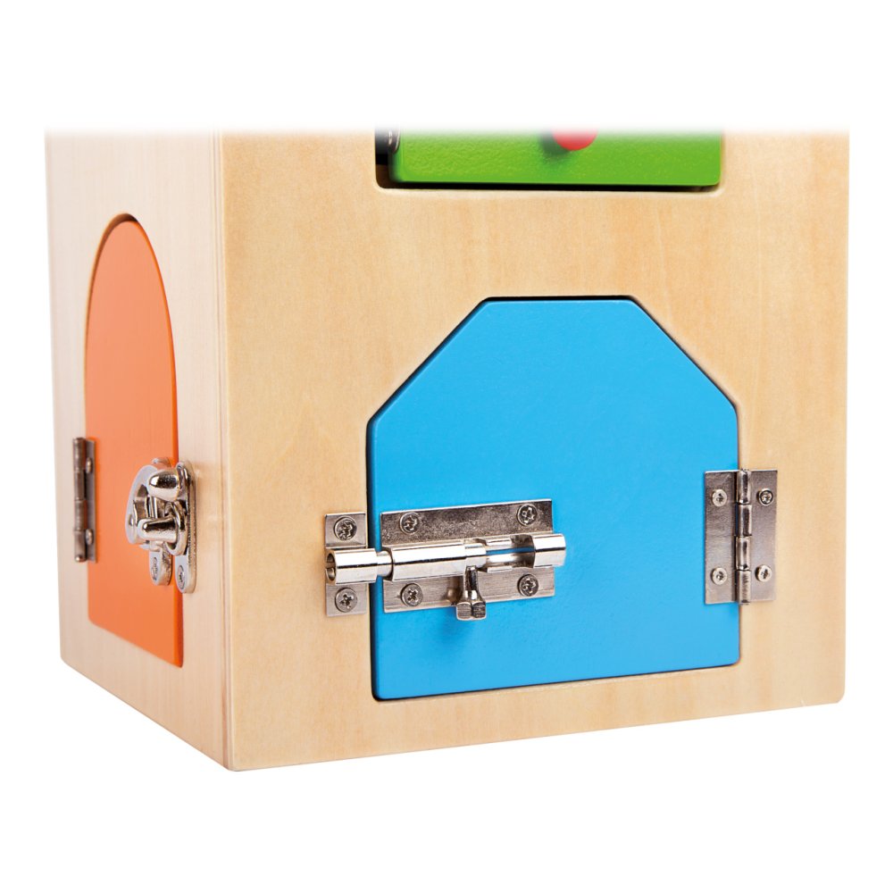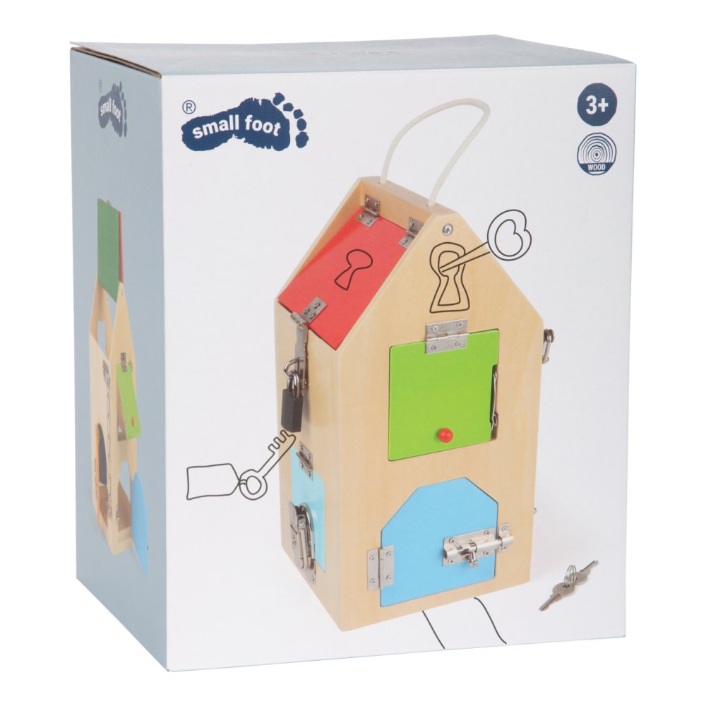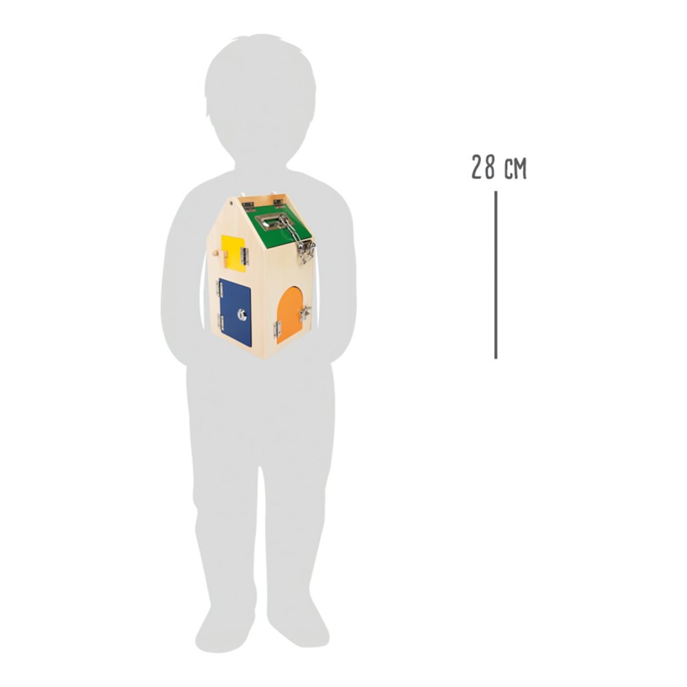 En esta casita de madera con un acabado de alta calidad, encontrará una cerradura en U y una cerradura cilíndrica, varios tornillos, palancas, bisagras y una cadena de seguridad que entrenan las habilidades motoras de los niños. Además, es muy fácil de transportar y garantiza experiencias "clave". Fabricado con madera duradera y piezas metálicas sólidas. Principales características: desarrolla las habilidades motoras finas de los niñosfomenta la curiosidad