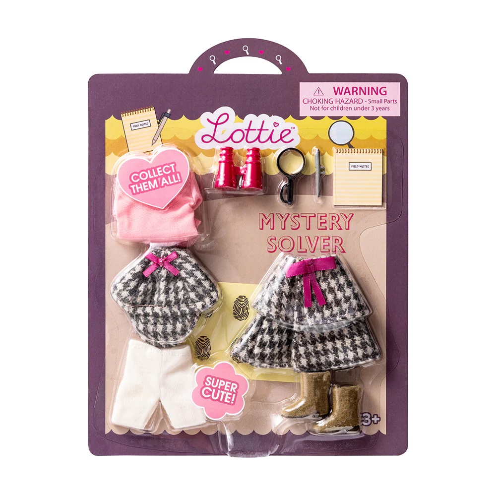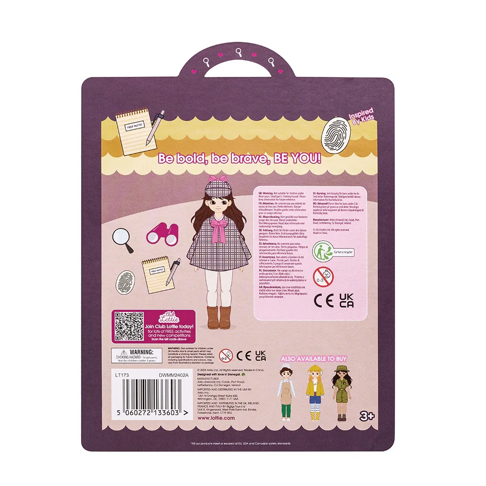 El conjunto de ropa con accesorios para muñecas Lottie para pequeños detectives entusiasmará a toda pequeña señorita Marple o al señor Poirot. Viste a tu muñeca Lottie con el típico poncho de cuadros, colócale un gorro de cuadros en la cabeza y equípala con una lupa, prismáticos, un bloc de notas y un bolígrafo para que parezca una verdadera detective. Permita que los niños se sumerjan en emocionantes aventuras de detectives, utilicen su talento de observación y razonamiento lógico para resolver misterios de detectives. El conjunto de ropa para muñecas fomenta el juego imaginativo, que desarrolla la confianza en sí mismos, el pensamiento creativo, las habilidades lingüísticas y la inteligencia social de los niños. La muñeca Lottie es una marca de muñecas inclusiva y galardonada inspirada en niños reales, lo que significa que representa a niños de diferentes orígenes étnicos, capacidades físicas, culturas y rompe estereotipos. Fue desarrollada en colaboración con académicos y expertos en desarrollo infantil. La muñeca no está incluida en el paquete. Contenido del paquete: poncho de cuadrosgorro a cuadroscamisetapantalones botas altasprismáticoslupabolígrafobloc de notas Principales características: desarrolla la confianza en sí mismos, el pensamiento creativo, las habilidades lingüísticas y la inteligencia social de los niñosmarca galardonada e inclusivala muñeca no está incluida en el paquete
