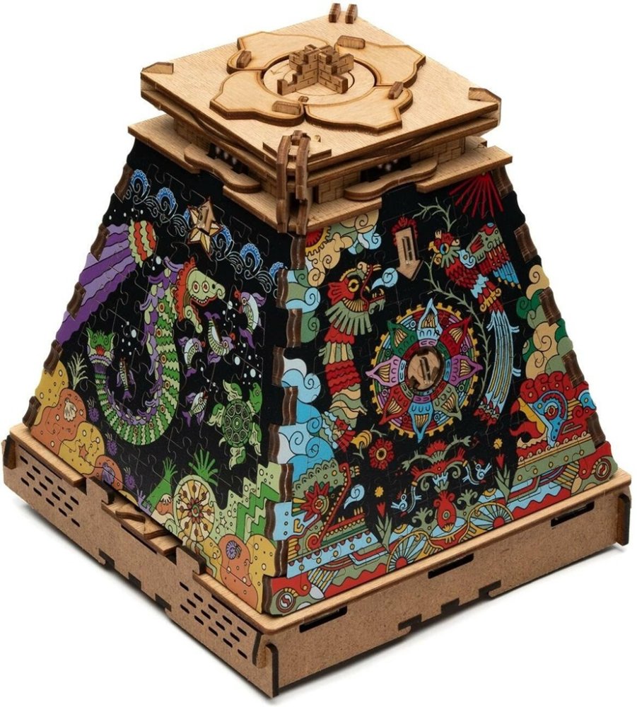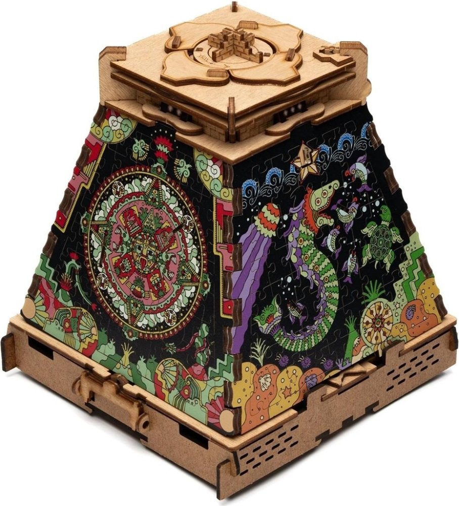 Si le gustan los retos y los cambios, cree otra capa del rompecabezas Pirámide del Sol (ID5019) colocando este puzzle en las paredes laterales de la pirámide y obtenga un nuevo aspecto para su inusual decoración. Colocar otra capa es fácil, cubra la imagen original con una capa negra, coloque los marcos y ensamble. Esta segunda capa del puzzle tiene únicamente un propósito decorativo, no se puede utilizar de ninguna manera para resolver el rompecabezas. Principales características: extensión del rompecabezas Pirámide del Sol – ID5019contiene 200 piezas en 4 juegos (cada juego para una pared de la pirámide), 4 marcospara 1 a 4 jugadorestiempo de juego de 90 a 120 minutos