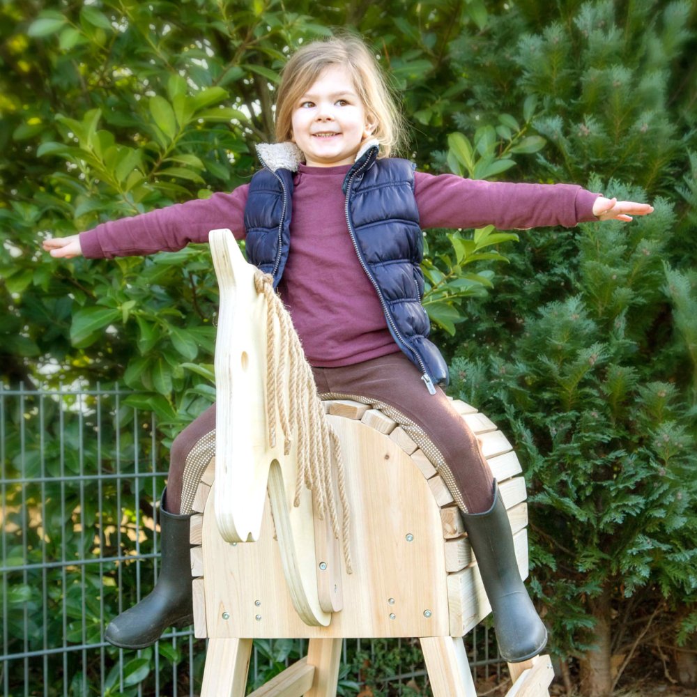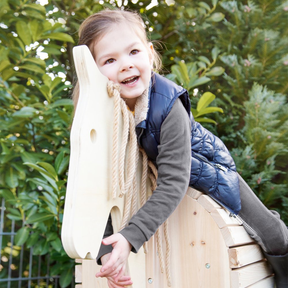 Los jinetes jóvenes y mayores pueden familiarizarse de forma lúdica con los conceptos básicos del cuidado y la equitación. La crin y la cola de sisal invitan a los niños a arreglar, trenzar y embellecer. Gracias al escalón incorporado, ¡subir será un juego de niños! Las patas inclinadas del caballo prometen mayor estabilidad y seguridad. ¡El caballo tiene un gran espacio de almacenamiento en el vientre! Ideal para guardar un cepillo para el aseo o un cabestro. ¡Ideal para el jardín o la habitación de los niños! El producto no está tratado; se puede pintar con un barniz de conservación según los deseos y necesidades del propietario. El tamaño del lomo del caballo se ha diseñado para el tamaño de la silla de montar, que se vende por separado. Principales características: cabestro incluido en el paquetecola y crin de sisalmadera duradera sin tratarespacio de almacenamiento en el vientreFamiliarización con las tareas de cuidado de forma divertida