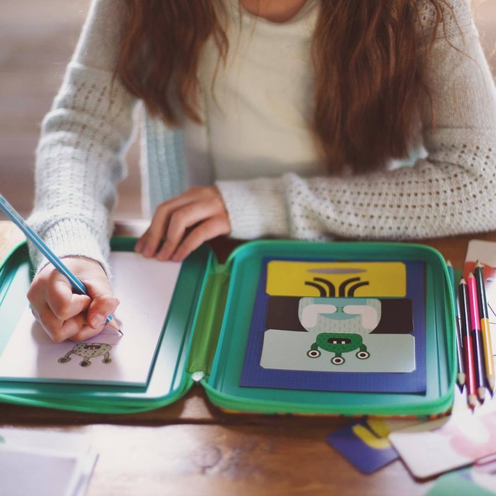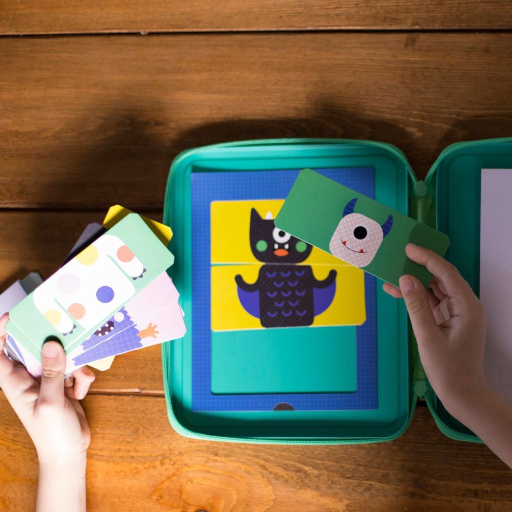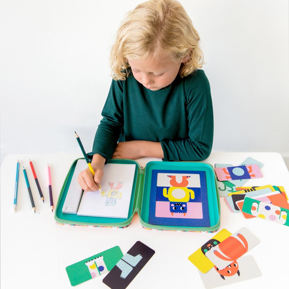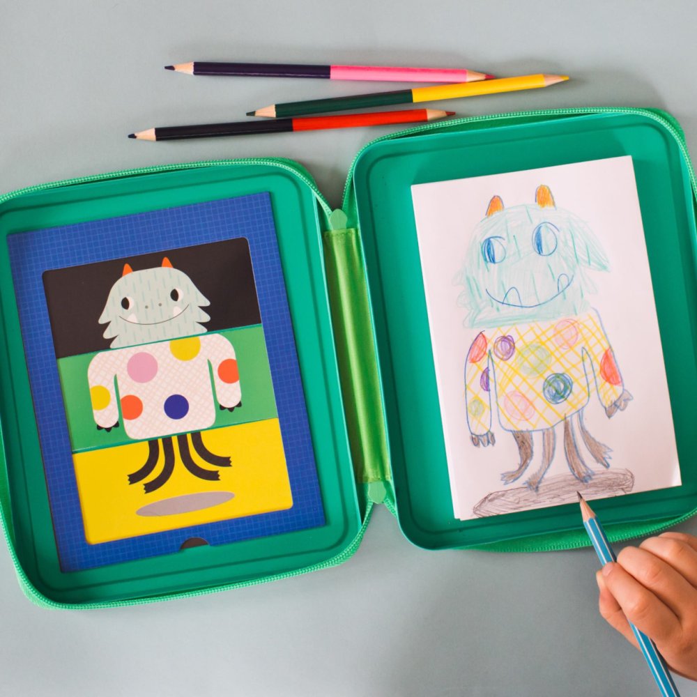 Crea una plantilla y dibuja un monstruo. En el paquete encontrarás 24 tarjetas con las que podrás construir un monstruo a tu gusto y luego intentar dibujarlo. El juego se guarda en un estuche magnético. Principales características: 24 tarjetasBloc de dibujo con parte trasera magnéticaTabla magnética4 lápices de colores dobles y un lápiz n.º 2 con goma de borrarEl estuche rígido se cierra con cremalleraImpreso con tintas vegetalesCumple y supera todas las normas de seguridad