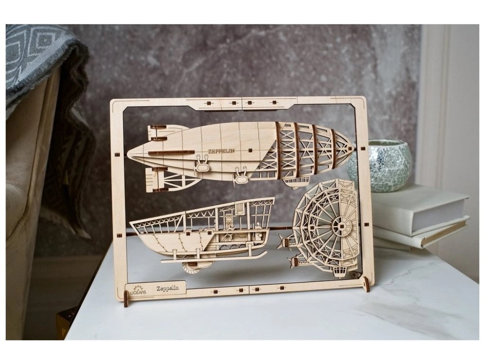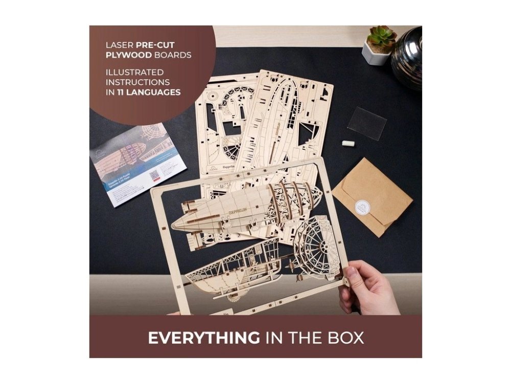 Le presentamos el puzzle de imágenes mecánicas en 2.5D del dirigible Zeppelin, otro de la colección de vehículos de transporte clásicos Classic Vehicles, que es diferente de todo lo que UGEARS ha fabricado antes. Estas imágenes de madera están diseñadas para exhibición estática, pero tienen partes móviles. El puzzle ofrece 3 vistas de este primer dirigible comercial del mundo, una vista lateral, una vista ampliada de la cabina y una vista frontal, y tiene varias partes móviles, incluyendo hélices, timón y estabilizadores. El dirigible Zeppelin está encajado en su propio marco, por lo que es adecuado para colgar en la pared, y se entrega con un soporte que le permite exhibir su trabajo en una mesa o en un estante. No se necesitan herramientas ni pegamento para montar el modelo. Simplemente saque las piezas precisas cortadas con láser de las placas de madera, encájelas y el modelo estará listo. Este kit de construcción también es adecuado para principiantes, el montaje tarda unos 30 minutos y el paquete incluye todo lo que necesita para el montaje, incluyendo cera, papel de lija e instrucciones con imágenes. El modelo está hecho de madera de calidad artística y puede dejarse con un atractivo aspecto natural o pintarse o teñirse según sus deseos (las pinturas no están incluidas en el paquete). Los primeros dirigibles tenían cuerpos cilíndricos largos, donde la tela se estiraba sobre un marco de metal sólido. Las bolsas de gas internas proporcionaban sustentación y los motores con empuje inverso, las hélices y un complejo sistema de costillas garantizaban la propulsión, la maniobrabilidad y la estabilidad. En 1929, el dirigible Graf Zeppelin dio la vuelta al mundo en 21 días. Además del transporte aéreo de pasajeros, los Zeppelines se utilizaron como bombarderos en la Primera Guerra Mundial y para la investigación científica en tiempos de paz. El desastre del Hindenburg el 6 de mayo de 1937 marcó el fin de la era de los dirigibles de pasajeros. Principales características: desarrolla la motricidad fina, la paciencia y la imaginación espacialmaterial y elaboración de alta calidad49 piezas cortadas con lásertiempo de montaje aprox. 30 minutosdificultad sencillalas instrucciones con imágenes están incluidas en el paqueteIdeal como regalodiseñado y fabricado en Ucrania