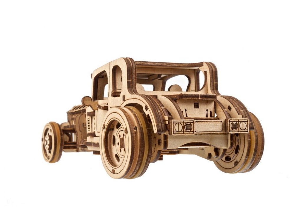 Cuando vea un coche tipo hot rod en la calle, ¿qué es lo primero que le llama la atención? ¿Es la pintura personalizada, los brillantes detalles cromados, el motor de alto rendimiento o las modificaciones de la carrocería que transformaron un aburrido modelo de fábrica en una hermosa supermodelo lista para la pasarela? Los Hot Rod son visiones automovilísticas personales hechas realidad. Son pura pasión: la expresión externa de un amor profundamente arraigado por los coches. Son el hijo de alguien, el orgullo y la alegría de alguien, alguien para quien la idea de comprar y conducir un coche de fábrica es inimaginablemente perezosa y aburrida. En Ugears lo entendemos. Nuestros ingenieros y diseñadores entienden ese tipo de obsesión automovilística que roza la locura y que hace que tu esposa se pregunte por qué prefieres quedarte en el garaje o en el taller un sábado por la noche hasta tarde, cacharreando con un coche. Así que aquí lo tienen, todos ustedes, locos fanáticos de los coches, todos ustedes, asombrosos constructores de hermosas máquinas: les traemos el Hot Rod Furious Mouse, el primer modelo de la nueva colección Dual Motors de Ugears. Comience su colección Dual Motors hoy mismo y prepárese para más modelos de coches que acelerarán su corazón. El modelo de coche Hot Rod Furious Mouse tiene una doble función de motor: puede dar cuerda al motor de resorte con seis vueltas completas de la llave de trinquete situada en el chasis del modelo de coche, o simplemente puede tirar del Hot Rod hacia atrás sobre una superficie plana, luego soltarlo y ver cómo el coche sale disparado, como cualquier juguete con motores de retroceso. Gire las ruedas delanteras del Hot Rod a la izquierda o a la derecha para tomar las curvas con elegancia o para correr en línea recta. Otros detalles del modelo Ugears Hot Rod Furious Mouse incluyen una escala realista, hermosos detalles del motor y el interior, y puertas dobles con mecanismo de bloqueo y manija. El kit de modelo Hot Rod Furious Mouse contiene 207 piezas y está clasificado como de nivel fácil. Simplemente saque las piezas de las tablas cortadas con láser y luego encájelas siguiendo nuestras instrucciones ilustradas paso a paso. Incluso los constructores de modelos principiantes deberían poder armar este modelo de coche de bricolaje en 4 horas o menos y luego disfrutar de horas de juego. Consejo importante para armar el Hot Rod Furious Mouse: antes de colocar el módulo de la carrocería, "desarrolle" el chasis (es decir, asegúrese de que todas las partes móviles estén ligeramente lijadas y lubricadas, y de que todos los engranajes se muevan suavemente durante las pruebas de manejo). Al igual que con toda la excelente línea de rompecabezas 3D, kits de bricolaje, autómatas, robots, rompecabezas de madera y modelos STEM Lab de Ugears, no necesita pegamento ni herramientas especiales para armar el Hot Rod, todo lo que necesita está en la caja. El coche Hot Rod Furious Mouse es una adición elegante a nuestro creciente catálogo de coches de carreras, motocicletas, camiones y otros excelentes modelos de automóviles de bricolaje de la marca Ugears. Es un gran regalo para cualquier amante de los coches o entusiasta de los rompecabezas 3D. Se puede dejar en un atractivo estado de madera natural o pintarlo o teñirlo con su propio esquema de color de su elección. Principales características: 207 piezas cortadas con precisiónDoble opción de propulsión del motor dificultad de montaje sencillapequeños detalles mecánicosdiseñado y fabricado en Ucrania