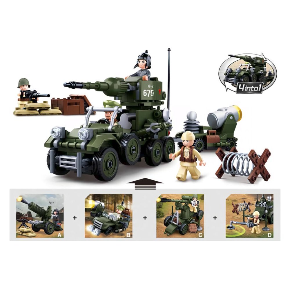 Mini kit de construcción de técnica de batalla de la serie WWII 4into1, cuya finalización crea la posibilidad de construir un gran modelo completo de tractor de artillería. Los innovadores sets de construcción Sluban se pueden combinar con sets de construcción similares de muchos otros fabricantes importantes. Están fabricados con plástico ABS de alta calidad, seguro y duradero. Cada set de construcción está equipado con instrucciones de montaje y embalado en una caja de papel impresa a todo color. Principales características:88 piezas, 1 figuradificultad mediaAdecuado como complemento para el vehículo semioruga soviético M38-B0685la finalización de la serie permite construir un modelo grandeFiguras innovadoras con partes del cuerpo giratorias y oscilantescompatible con sets de construcción de otros fabricantes