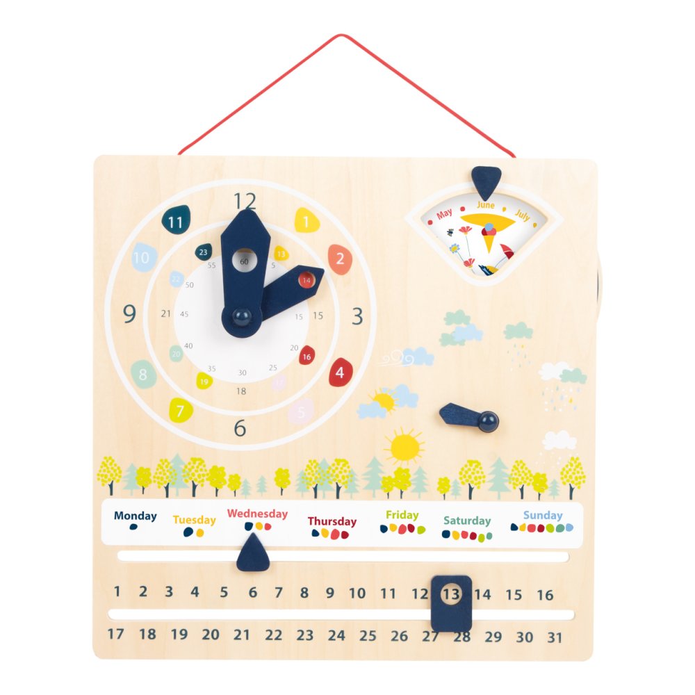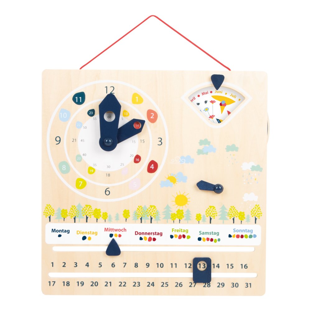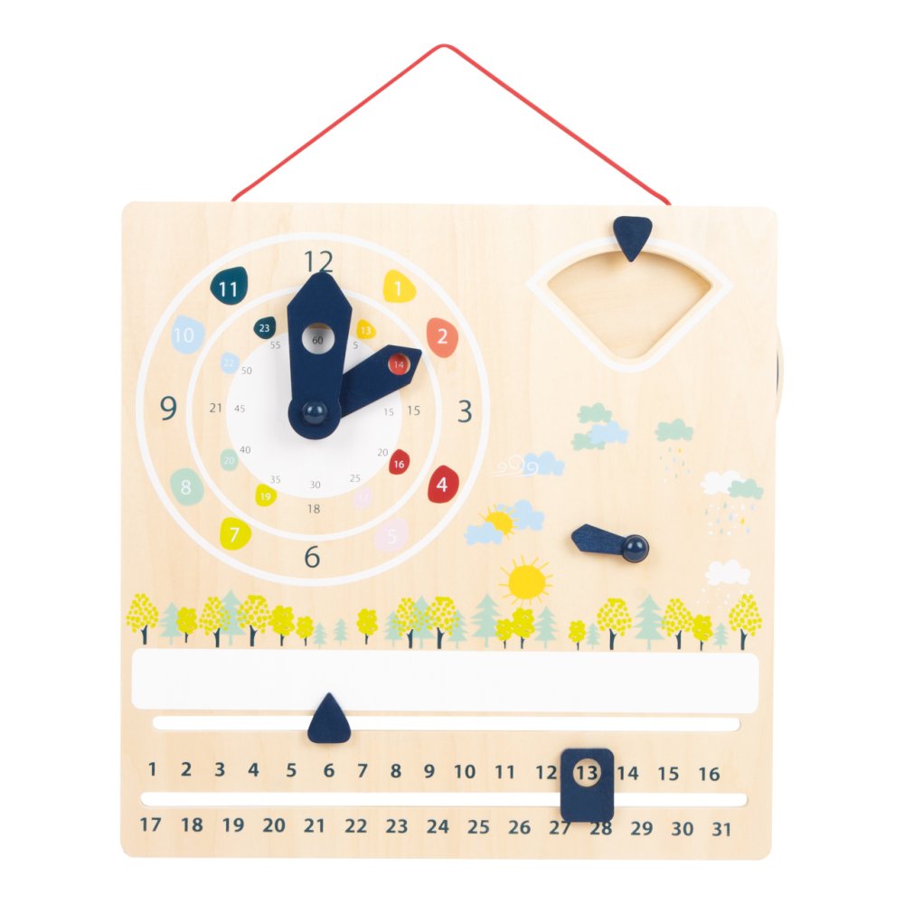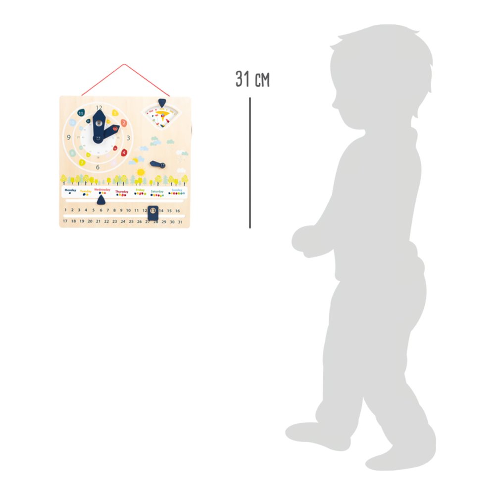 Apoyan a los niños a aprender la hora en sistemas de 12 y 24 horas. Al mismo tiempo, transmiten conocimientos sobre el clima, los días de la semana, los meses y las estaciones de forma lúdica con sencillas ilustraciones. Al ajustar las manecillas, también se entrenan las habilidades motoras. Con dispositivo para colgar y pegatinas, para uso en 15 idiomas europeos: CZ, DE, DK, EN, ES, FI, FR, GR, IT, NL, NO, PL, PT, RU, SE. Principales características: practica las habilidades motorasuso en 15 idiomas europeosenseña a reconocer la hora y la fechafabricado con madera 100% FSC La marca y el certificado FSC® (Forest Stewardship Council) garantizan que la madera con la que se fabricó el producto no se extrajo ilegalmente y procede de bosques gestionados de forma sostenible o respetuosa con la naturaleza, en los que se cumplen estrictos requisitos medioambientales y sociales. La marca FSC® en el producto significa que, con su compra, está ayudando a proteger los bosques y a apoyar una gestión forestal sostenible, responsable o respetuosa con la naturaleza, gracias a la cual nuestros bosques son más estables, saludables, tienen una composición de especies naturales y resisten mejor los efectos negativos del cambio climático.