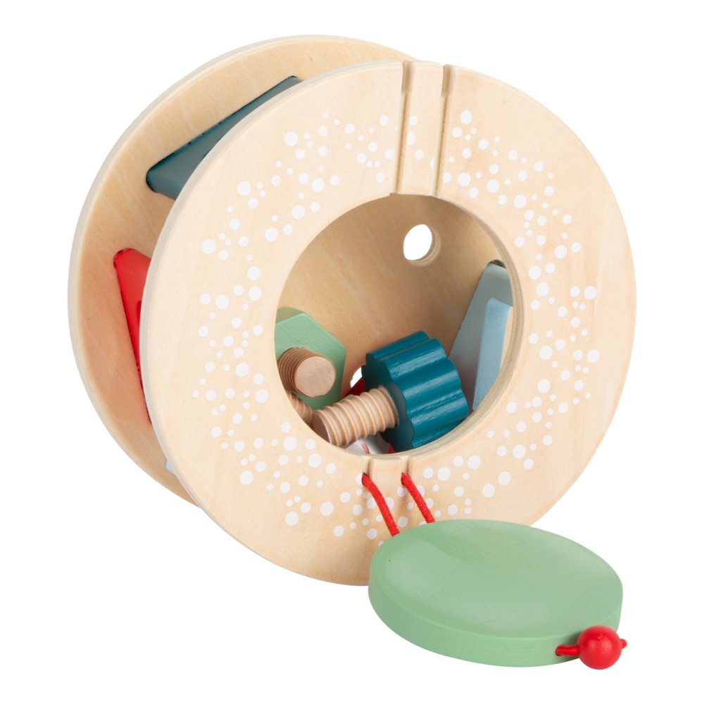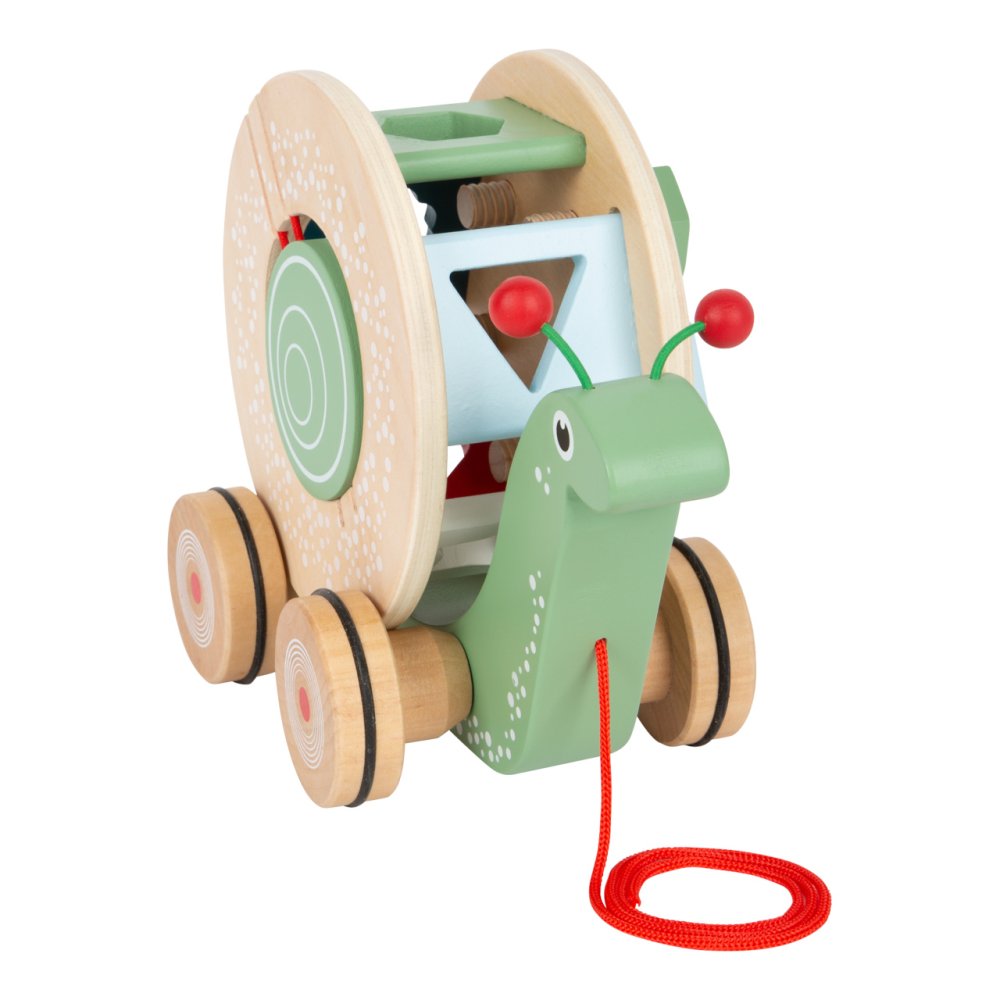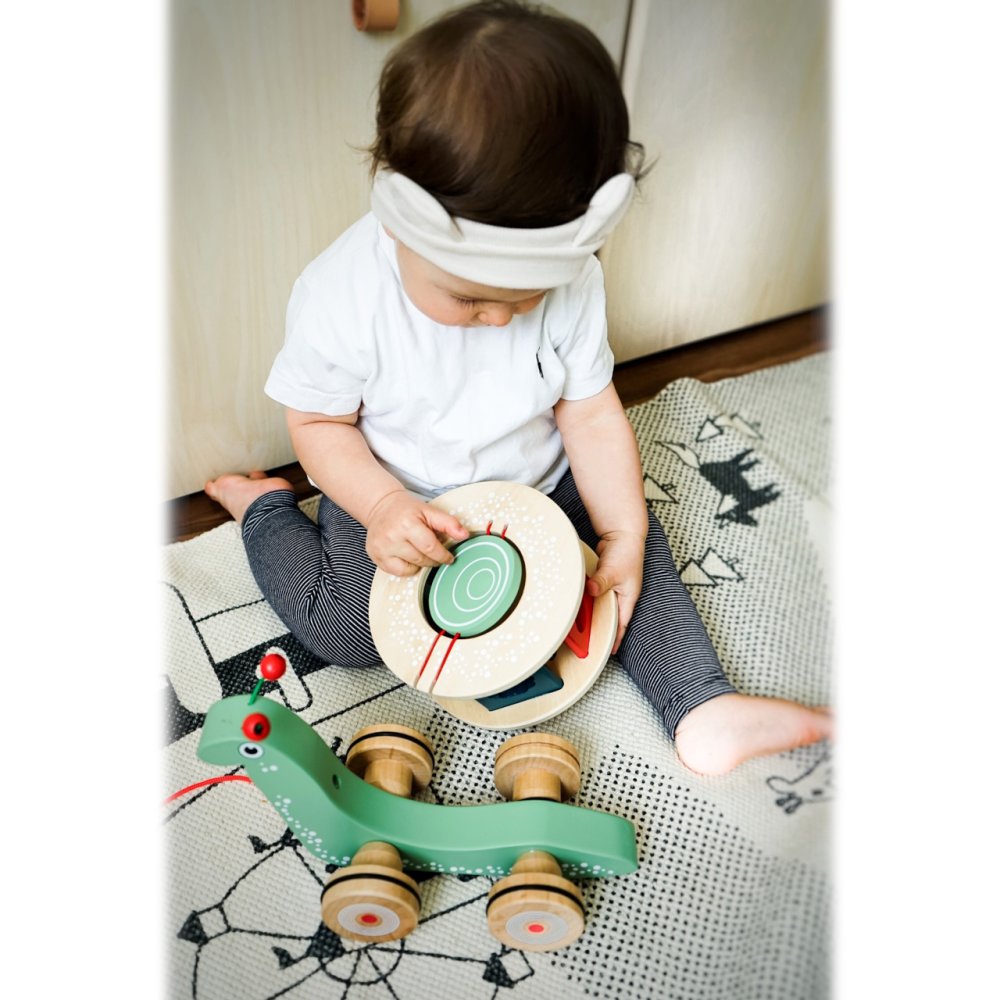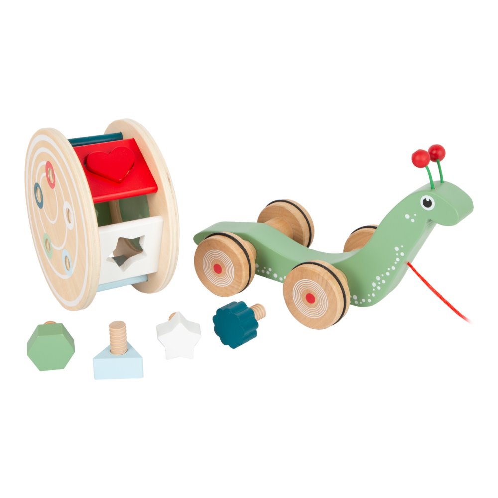 Este juguete de madera para arrastrar, con ojos amigables, muchos detalles y ruedas de goma, inspira a los niños a dar sus primeros pasos. Al tirar, la concha del caracol gira y las piezas del interior emiten un sonido. También puedes fijar las piezas al lado de la concha con sus cuerdas. El juguete es una mezcla de madera natural y teñida en colores modernos. La concha del caracol es separable y funciona como un encajable. En el lado de la concha hay una puerta separable con la que puedes sacar las piezas del encajable. También puedes guardarlas fijadas a la concha para que no hagan ruido. Un juguete de motricidad inteligente perfecto para los niños. Principales características Juguete para arrastrar, de motricidad y educativo en unoLa concha separable puede utilizarse como encajableDurante el juego, entrena la motricidad de los niños de diferentes manerasDurante el juego, estimula la percepción auditiva de los niñosLa concha tiene una puerta lateral con la que se pueden extraer fácilmente las piezas insertadasLas ruedas de goma garantizan un funcionamiento silencioso