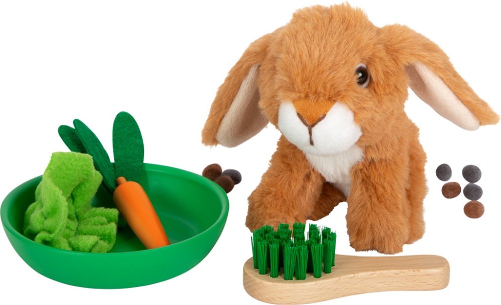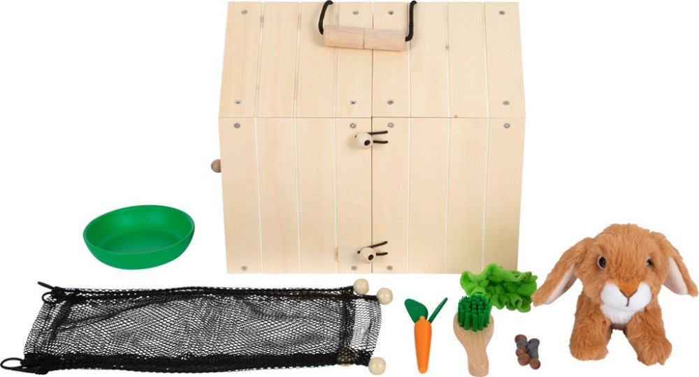 ¡Un refugio adorable y un hocico aún más adorable dentro! ¡Una conejera de madera estable (que también se puede utilizar para el transporte) consta de dos pequeñas casetas que se pueden conectar con bucles! En una mitad, el conejo de peluche puede dormir sin ser molestado y, en el otro lado, puede mirar a su alrededor a través de la red. Se pueden conectar dos vallas de malla a las casetas para crear un recinto al aire libre. Gracias a los numerosos accesorios, el recinto para conejos está inmediatamente listo para jugar y ofrece situaciones realistas en el juego de roles. Si los niños aún no pueden tener una mascota de verdad, ¡este set es la alternativa perfecta! De hecho, los niños pueden entrenar importantes habilidades sociales y emocionales mientras simulan el cuidado de un animal. El paquete contiene un conejo de peluche, un cepillo, un cuenco, una zanahoria de madera y fieltro, un trozo de lechuga y un par de excrementos de fieltro. La pared negra en la parte posterior de la caseta se puede escribir con tiza. Principales características: los niños aprenden a asumir la responsabilidad de sus mascotasincluye complementos y necesidadesfomenta la creatividad
