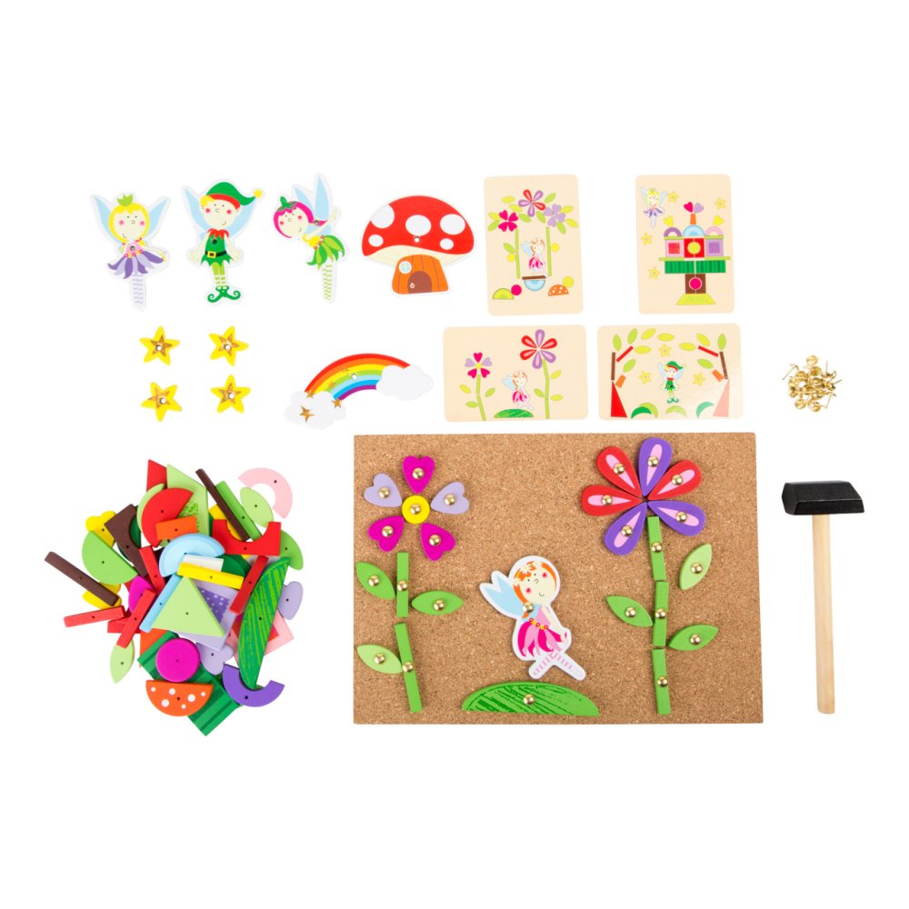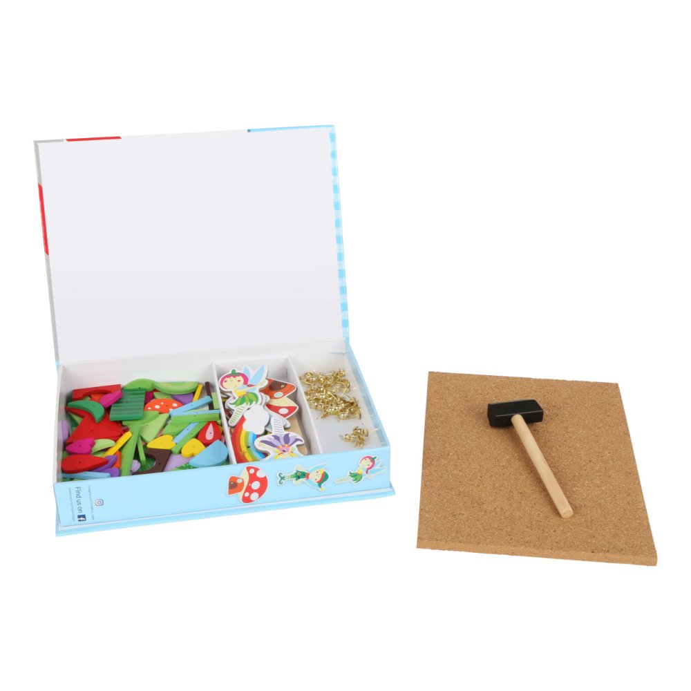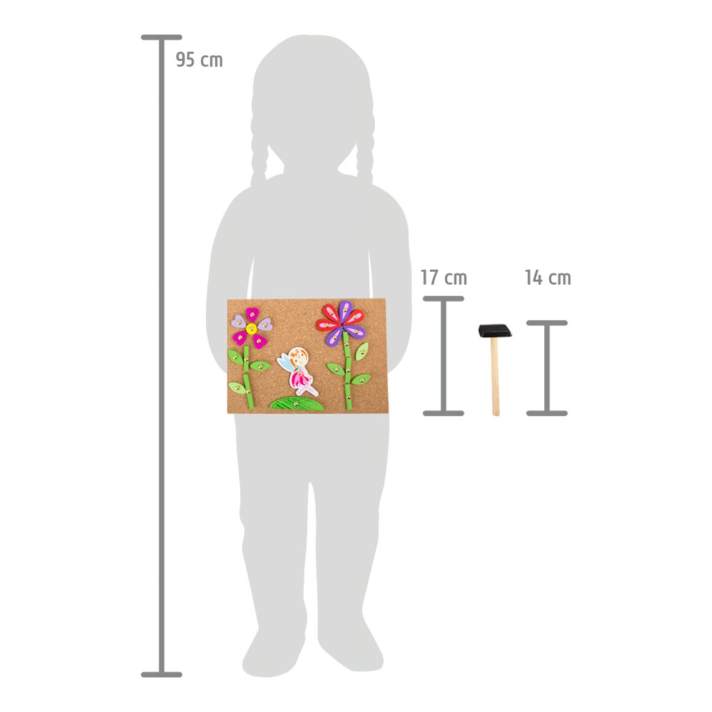 Con este juego, cada niño puede crear su propia imagen de pared con un motivo de hadas. Las piezas de madera y cartón del rompecabezas tienen agujeros pretaladrados, los pequeños clavos se pueden clavar fácilmente en el tablero de corcho con un martillo de madera. El paquete también contiene cuatro tarjetas impresas a doble cara con sugerencias de motivos. Principales características: fomenta la creatividad y la concentraciónfavorece la motricidad finapráctica caja de almacenamiento