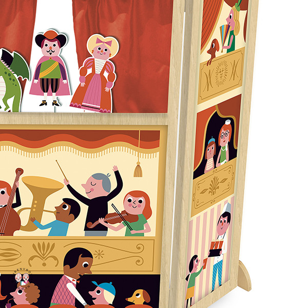 Espléndido teatro de tres paredes decorado con personajes de cuento de hadas. En la pared central, el teatro tiene una ventana con cortina en la parte superior. Los niños pueden inventar su propia historia y entretener a sus amigos o familiares. Contiene 3 marionetas. Ilustrado por Ingela P. Arrhenius. Principales características: Desarrolla la imaginación y las habilidades de comunicacióndiseño de Ingelou P. Arrhenius La artista sueca Ingela Peterson Arrhenius nació en 1967. El arte y el diseño siempre han tenido un lugar en su vida, y antes de comenzar su carrera como ilustradora, Ingela trabajó como directora artística en Estocolmo. Después estudió diseño publicitario y gráfico en una escuela de arte también en Estocolmo. En 1992, comenzó a trabajar como ilustradora independiente y trabajó internacionalmente en publicidad, diseño, publicaciones… En el pasado, creó patrones de impresión para telas, papeles pintados, papelería, y también trabajó en embalajes, diseño de productos, accesorios para el hogar y juguetes. Sus carteles y juguetes de diseño se pueden encontrar en todo el mundo. Le apasiona el estilo retro, que se puede ver claramente en sus obras, así como en su entusiasmo por la tipografía y los colores. Actualmente vive en Estocolmo con su marido y dos hijos.