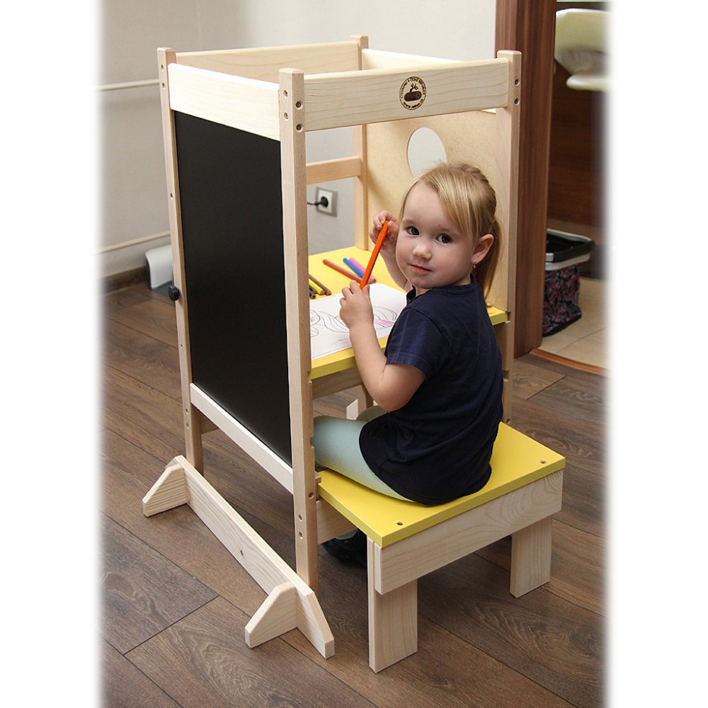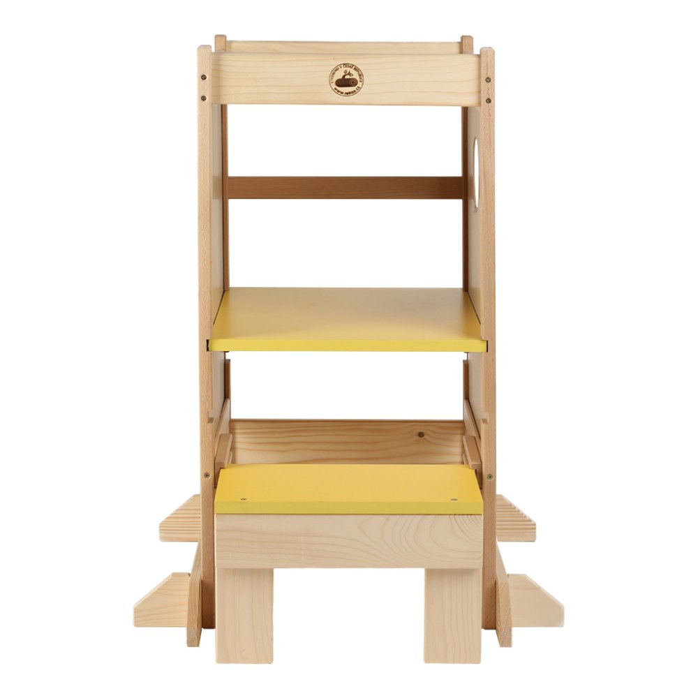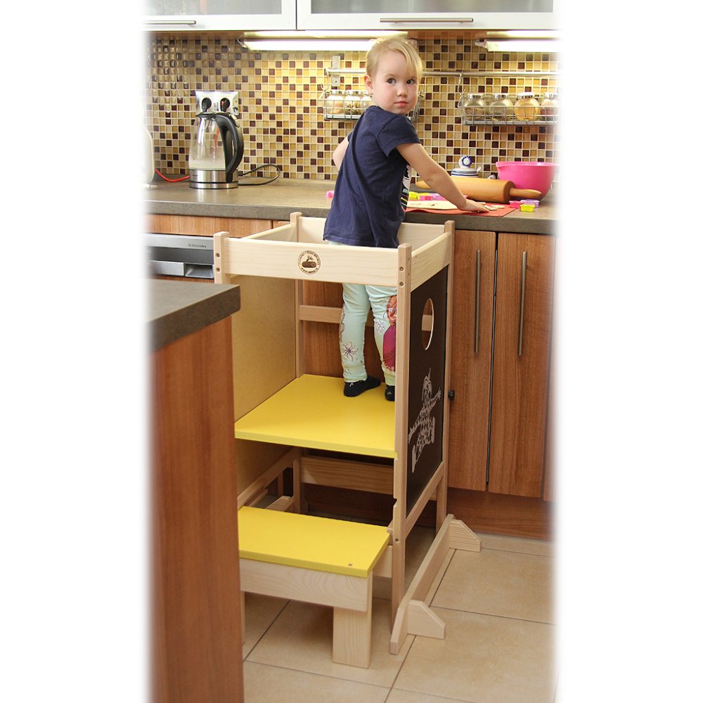 La torre de aprendizaje es un taburete multiusos para sus hijos. Está fabricada con una combinación de madera de haya y abeto. Permite que el niño participe en diversas actividades creativas en la encimera de la cocina o en el escritorio. Trabajar en la encimera de la cocina mejora las habilidades motoras del niño y usted tiene al niño constantemente bajo control. La torre permite a los niños estar a la altura de la encimera, ver todo lo que haces y crear contigo. La torre de aprendizaje consta de una superficie de pie donde el niño se apoya, un escalón para subir y una barandilla alrededor. Cuando la utilice, no deje la torre de aprendizaje en el espacio, sino que colóquela siempre de lado, frente al escalón, contra un obstáculo sólido (encimera, etc.). El taburete multiusos se utiliza como: torre de pie: dos posiciones de altura taburete con silla pizarra para tizasdivertida pizarra con un payaso con posibilidad de lanzar pelotas Advertencia:Con la venta de la torre de aprendizaje no asumimos ninguna responsabilidad por la seguridad del niño. ¡El niño en la torre de aprendizaje debe estar bajo la supervisión constante de un adulto! Principales características: mejora las habilidades motorasconstrucción duradera, multifuncionalfabricado en la República Checa