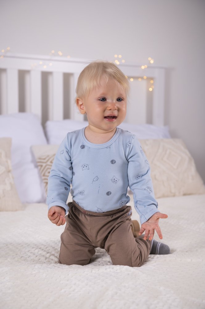 El cuerpo de manga larga de punto grueso es perfecto para los meses fríos. Es adecuada como capa base para salir a la calle, pero combinada con pantalones de chándal o monos también se puede llevar en casa. El body está hecho de un material elástico y cómodo que se adapta a múltiples tallas. El cierre con botones a presión está solo en la entrepierna del body. Gracias a esto, es ideal para la silla de coche o los capazos. De hecho, nada estorba, presiona ni rasca a la altura de los cinturones de seguridad. Para facilitar su colocación, el escote es más profundo y muy elástico.