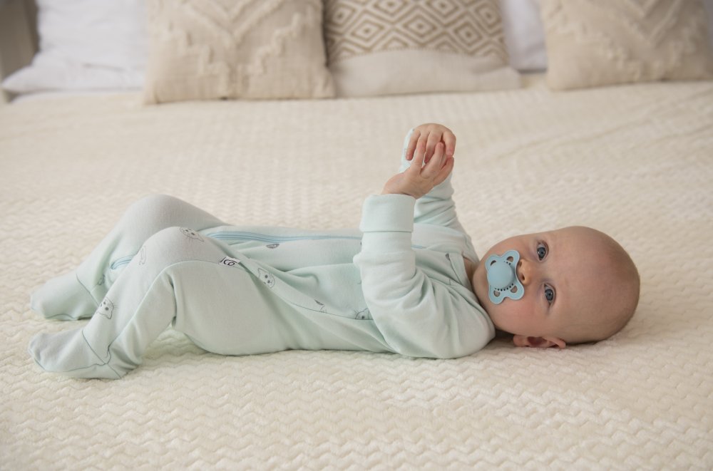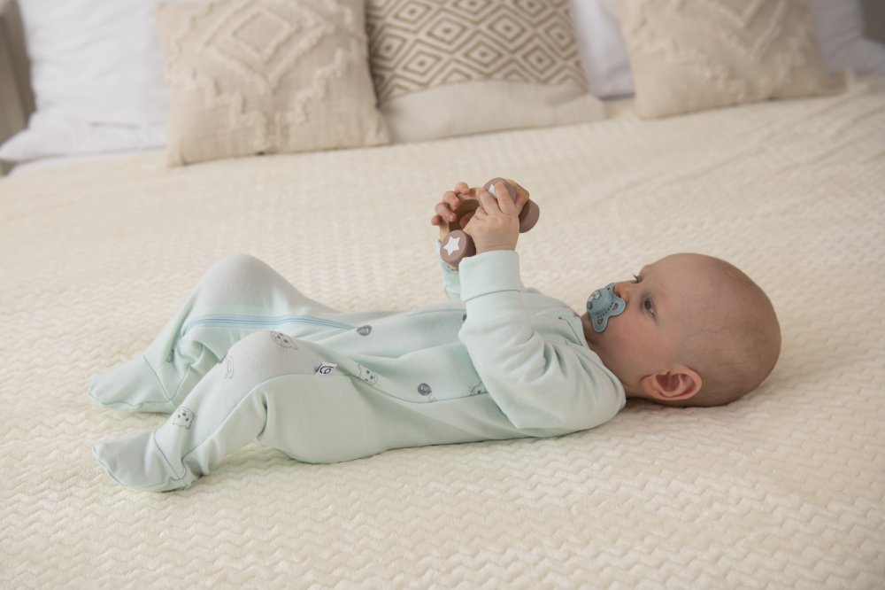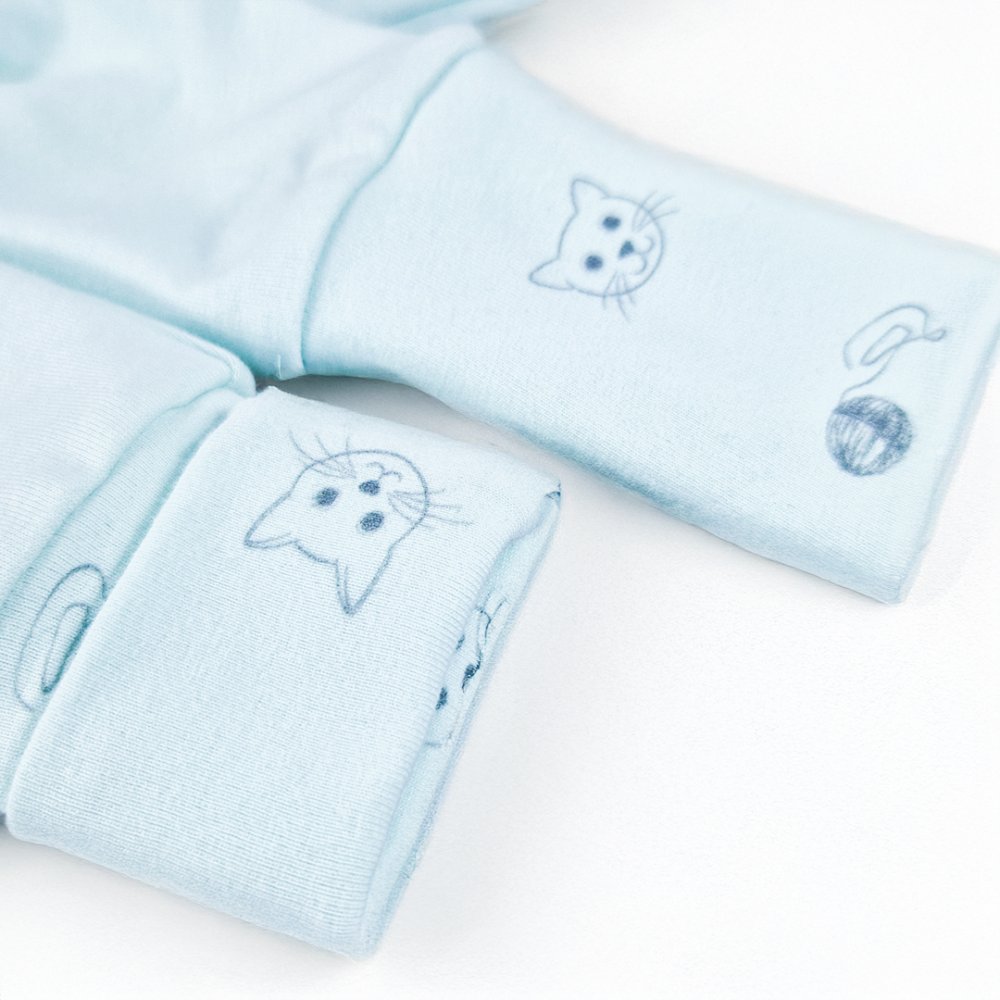 Cómodo pelele para bebé de punto de algodón y material termorregulador Outlast®. El pelele tiene perneras con forma de polaina. Las mangas son largas y tienen parches anchos que se pueden enrollar para ajustar la longitud de las mangas si es necesario. El mono se abrocha con una larga cremallera, lo que facilita su colocación. Una vez abrochada, la cremallera deslizante puede ocultarse en un gorro especial bajo la barbilla para evitar el pinzamiento del mentón. El mono lleva etiquetas planchadas en el interior que no presionan ni irritan la delicada piel del bebé.